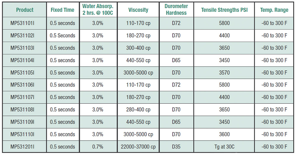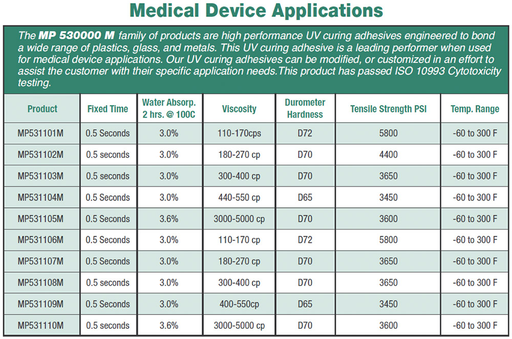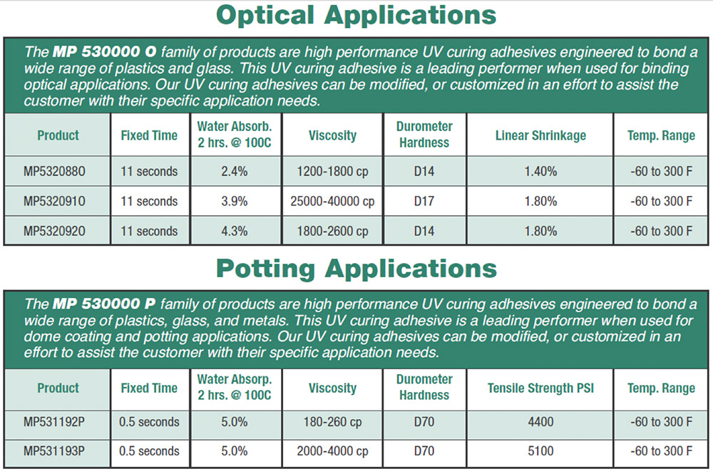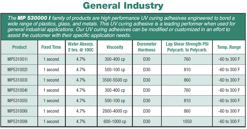 The MP 530000 SERIES is made up of a complete range of UV curing adhesives that are used in a diverse range of assembly applications. These applications include bonding, sealing, coating, tacking, potting, and encapsulating. They are used in a wide range of product assembly applications that include automotive, electronic, medical, industrial, etc. Engineers have found that the MP 530000 SERIES is an essential tool in improving overall product quality, lowering per unit cost, reducing processing time, and allows for innovative design solutions. The MP 530000 SERIES are single component, solvent free materials that cure in seconds when exposed to UV/visible light, and have been engineered to meet specific application requirements.